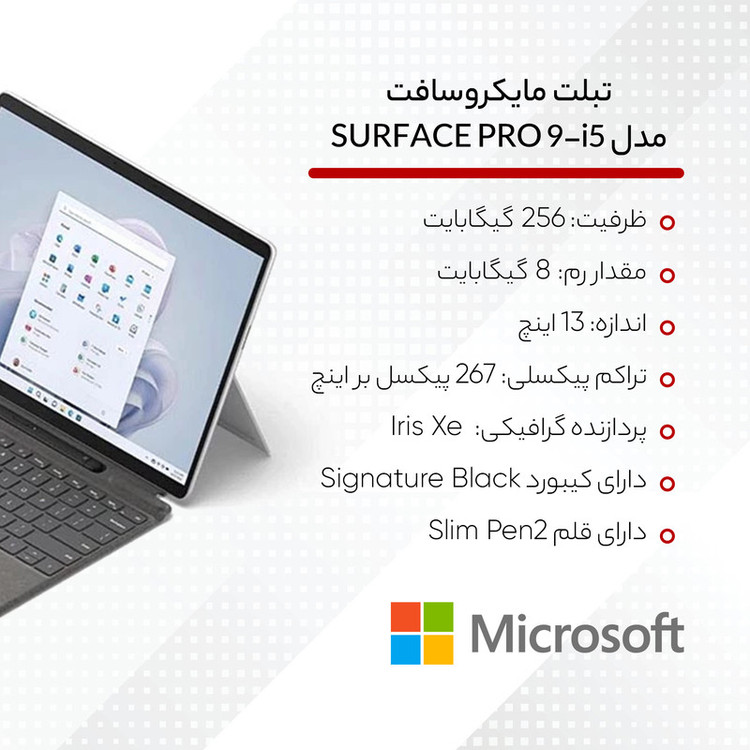 تبلت مایکروسافت مدل Surface Pro 9-i5 1235U ظرفیت 256 گیگابایت و رم 8 گیگابایت به همراه کیبورد Signature Black و قلم Slim Pen 2