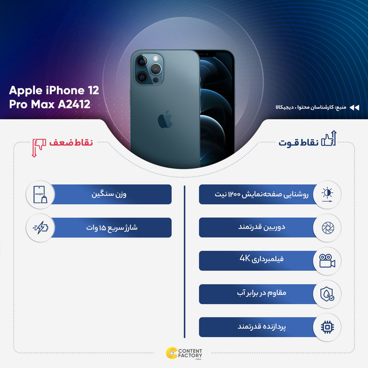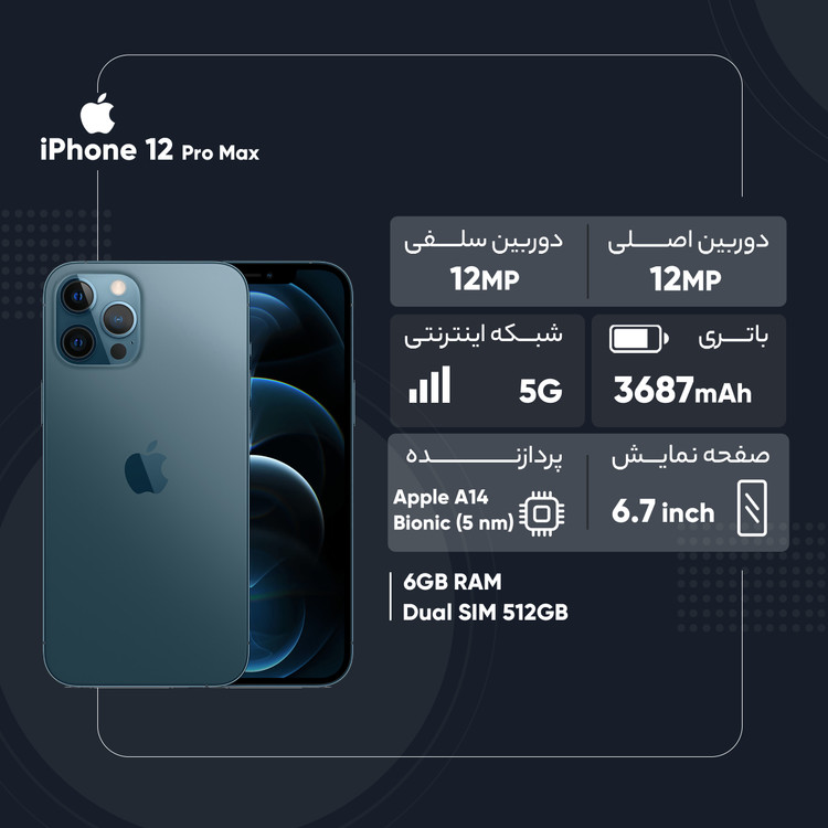 گوشی موبایل «iPhone 12 Pro MAX» از محصولات پرطرفدار و بالاردهی شرکت اپل است که با چند ویژگی جدید و دوربین چهارگانه روانه بازار شده است. نمایشگر آیفون 12 Pro MAX به پنل Super Retina مجهز شده است تا تصاویر بسیار مطلوبی را ارائه کند. این نمایشگر رزولوشن بسیار بالایی دارد؛ بهطوریکه در هر اینچ از ابعاد 6.7 اینچی خود، حدود 458 پیکسل را جای داده است که این عدد دقیقاً با تراکم پیکسلی iPhone XS برابر است. قاب پشتی این گوشی هم از شیشه ساخته شده تا هم گوشی مشکل چندانی در آنتندهی نداشته باشد و هم امکان شارژ بیسیم باتری در این گوشی وجود داشته باشد. البته، بدنهی شیشهای این گوشی در قابی فلزی گنجانده شده تا در کنار زیبایی، از مقاومت خوبی هم برخوردار باشد. لازم به ذکر است که بدنهی این گوشی در برابر خط و خش مقاومت زیادی دارد و همچنین، آب و گردوغبار بهراحتی روی آیفون 12 Pro MAX تأثیر نمیگذارند. جالب است بدانید که این گوشی میتواند به مدت 30 دقیقه در عمق چهار متری آب دوام بیاورد. اما تفاوت این گوشی با گوشیهای نسل پیشین خود، دوربینهایی است که این بار به شکل چهارگانه در قاب پشتی جا خوش کردهاند. سه دوربین با سنسورهای 12مگاپیکسلی به همراه دوربین چهارم از نوع عمیق TOF 3D LiDAR scanner عکسهایی با کیفیتِ بسیار بالا و کاملاً رضایتبخش را ثبت میکنند. از نظر سختافزاری هم این گوشی از تراشهی A14 بهره میبرد تا بتواند علاوه بر کارهای معمول، از قابلیتهای جدید واقعیت مجازی که اپل این روزها روی آن تمرکز خاصی دارد، پشتیبانی کند. به گفته شرکت اپل، این گوشی دارای سرعتی 80 برابر نسخه 11 خود است. گوشیهای نات اکتیو با قرار گرفتن سیمکارتهای داخلی اکتیو میشوند و برخلاف مدل اکتیو پلمپ کالا باز نشده است. گوشیهای اکتیو برند اپل هم به این شکل هستند که به دلیل محدودیتهای برخی از محصولات اپل برای کشور ایران، در کشورهای همسایه بهصورت رسمی با یک بار قرار گرفتن سیمکارت، اکتیو شده و پلمپ میشوند و باید بدانید که این پروسه هیچ مشکلی در راستای گارانتی کالا بههمراه ندارد. پارتنامبرهای اروپا و ژاپن و امارات تک سیمکارت هستند و پارتنامبرهای مربوط به امارات هم از فیس تایم پشتیبانی نمیکنند. پارتنامبر JA (ژاپن) هم حتی در حالت سایلنت صدای شاتر عکس قطع نمیشود.