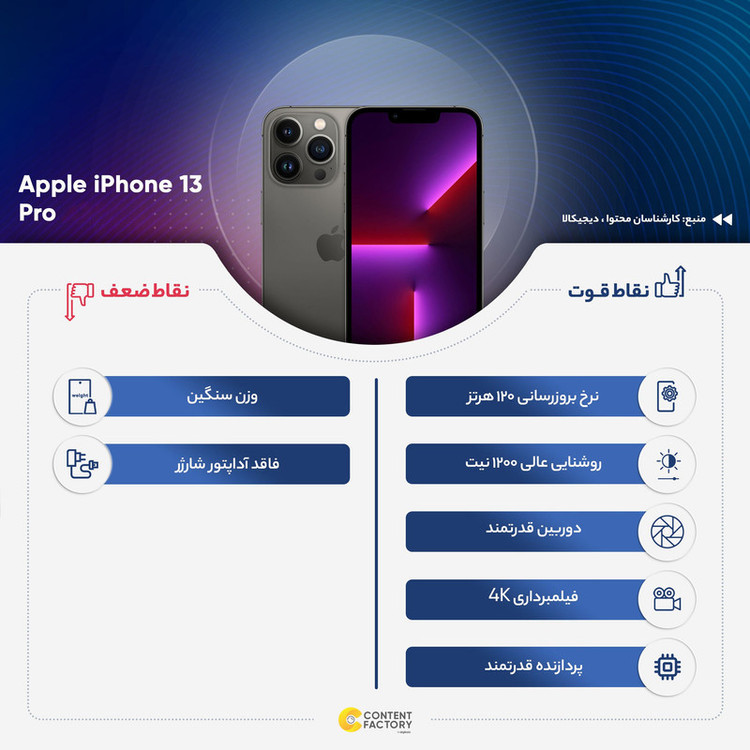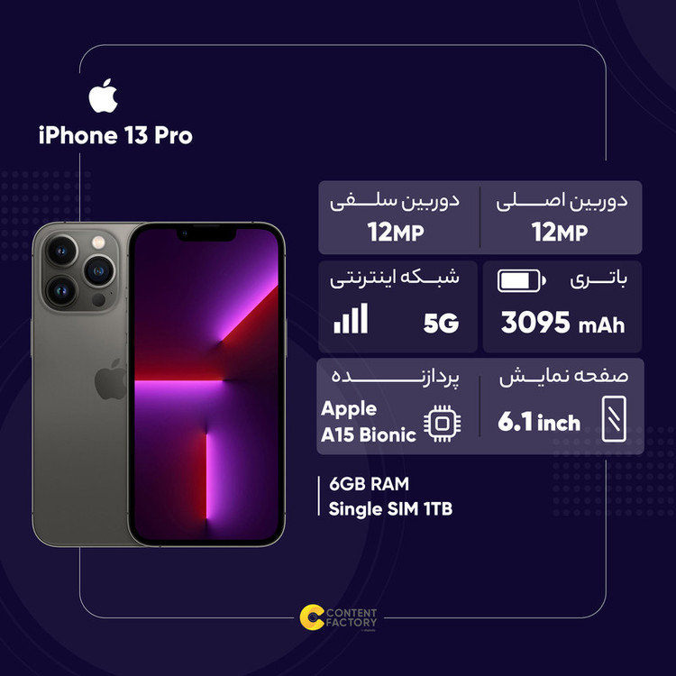 آیفون 13 پرو مکس، آیفون 13 پرو، آیفون 13 و آیفون 13 مینی از محبوبترین گوشیهای هوشمند شرکت اپل شناخته میشوند. آیفون 13 پرو مکس بدون شک به مشخصات فنی قدرتمندتری به نسبت مابقی اعضای این خانواده مجهز شده است. البته، گوشیهای این خانواده از نظر طراحی تفاوت چندانی با نسل قبلی پرچمداران این شرکت ندارند و تنها وجه تمایز در بین این گوشیها به استفاده از ناچ با عرض کمتر خلاصه میشود. آیفون 13 پرو به صفحهنمایشی 6.1 اینچی با رزولوشن 2532x1170 پیکسل مجهز شده است و همچنین برای اولین بار در تاریخ گوشیهای هوشمند اپل، شاهد به کار گیری صفحهنمایشی با توانایی ارائه نرخ بروزرسانی 120 هرتز هستیم. این صفحه نمایش بدون شک میتواند عملکردی بسیار روانتر و به مراتب باکیفیتتر به نسبت نسلهای قبلی خود ارائه کند. این صفحهنمایش توانایی ارائه حداکثر میزان روشنایی 1200 نیت (شمع در متر مربع) را دارد که همین امر سبب میشود تا در شرایط نوری متنوع و حتی زیر تابش مستقیم نور خورشید هم، وضوح تصویر بسیار خوبی داشته باشد. در قسمت پشتی این گوشی سه سنسور دوربین به همراه یک سنسور LIDAR با همان طراحی آیفون 12 پرو مکس قرار گرفتهاند. یک سنسور دوربین اصلی با رزولوشن 12 مگاپیکسلی با گشودگی دریچه دیافراگم f/1.5، سنسور دوربین 12 مگاپیکسلی از نوع فوق عریض (Ultra Wide) و سنسور 12 مگاپیکسلی از نوع تله فوتو، دوربین سهگانه آیفون 13 پرو را تشکیل میدهند. پردازنده A15 بایونیک هم اینبار قدرتمندتر از همیشه با شش هسته (2 هسته قدرتمندتر و 4 هسته با صرفه انرژی کمتر) این پرچمدار قدرتمند را همراهی میکند. گوشیهای نات اکتیو با قرار گرفتن سیمکارتهای داخلی اکتیو میشوند و برخلاف مدل اکتیو پلمپ کالا باز نشده است. گوشیهای اکتیو برند اپل هم به این شکل هستند که به دلیل محدودیتهای برخی از محصولات اپل برای کشور ایران، در کشورهای همسایه بهصورت رسمی با یک بار قرار گرفتن سیمکارت، اکتیو شده و پلمپ میشوند و باید بدانید که این پروسه هیچ مشکلی در راستای گارانتی کالا بههمراه ندارد. پارتنامبرهای اروپا و ژاپن و امارات تک سیمکارت هستند و پارتنامبرهای مربوط به امارات هم از فیس تایم پشتیبانی نمیکنند. پارتنامبر JA (ژاپن) هم حتی در حالت سایلنت صدای شاتر عکس قطع نمیشود.