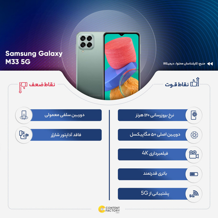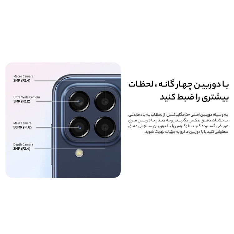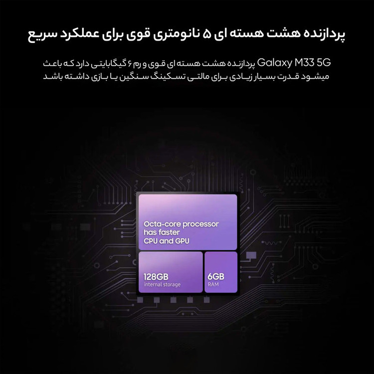 گوشیهای میانرده سری A سامسونگ همواره توانستهاند با بهره بردن از مشخصات فنی مناسب در کنار قیمتی مقرون بهصرفه، عملکرد قابل قبولی را از خود بهنمایش بگذارند. سامسونگ Galaxy M33 5G هم یکی از گوشیهای هوشمند میانرده باکیفیت این سری است. طراحی کلی در نظر گرفته شده برای این گوشی طراحی آشنایی است و در نمای روبهرویی به صفحهنمایش با ابعاد 6.6 اینچ و رزولوشن 1080×2408 پیکسل از نوع TFT LCD مجهز شده است. با توجه به توانایی نمایش 400 پیکسل در هر اینچ و حداکثر نرخ بروزرسانی 120 هرتز، نشان از آن دارد که با صفحهنمایش باکیفیتی روبهرو هستیم. بریدگی قطرهای شکل ناچ در قسمت بالایی و مرکزی صفحهنمایش، سنسور دوربین سلفی با رزولوشن 8 مگاپیکسل را در خود جای داده که برای ثبت تصاویر در نور روز و تماسهای تصویری، عملکرد قابل قبولی دارد. در قسمت پشتی هم یک سنسور دوربین اصلی با رزولوشن 50 مگاپیکسل از نوع عریض (wide) در کنار سنسور 5 مگاپیکسل از نوع فوق عریض (ultrawide) در کنار دو سنسور با رزولوشن 2 مگاپیکسل از نوع سنجش عمق و ماکرو، سنسورهای دوربین چهارگانه سامسونگ Galaxy M33 را تشکیل میدهند. توانایی ضبط ویدیو با حداکثر کیفیت 4K سبب شده تا عملکرد خوبی را از سنسور دوربین این گوشی هوشمند میانرده در بخش فیلمبرداری شاهد باشید. Galaxy M33 5G به پردازنده اختصاصی اگزینوس 1280 شرکت سامسونگ مجهز شده است که توانایی ارائه عملکرد کاملا قابل قبولی را در اجرای بازیهای سنگین (مثل کالآفدیوتی موبایل و آسفالت 9) و نرمافزارهای محبوب و کاربردی دارد. همانند اکثر گوشیهای هوشمند میانرده سری A، سامسونگ Galaxy M33 5G هم به باتری قدرتمندی با میزان ظرفیت 5000 میلیآمپرساعت مجهز شده که در شرایط استفاده معمولی به ازای هر بار شارژ صد درصدی، طول عمر مفید (زمان آماده بهکار) دو روز را ارائه میکند. گوشیهای اکتیو هم به این شکل هستند که به دلیل محدودیتهای برخی از محصولات برای کشور ایران، در کشورهای همسایه بهصورت رسمی با یک بار قرار گرفتن سیمکارت، اکتیو شده و پلمپ میشوند و باید بدانید که این پروسه هیچ مشکلی در راستای گارانتی کالا بههمراه ندارد.