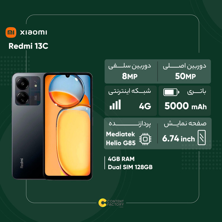 شاید شما هم به دنبال خرید گوشی هوشمندی باشید که در کنار بهره بردن از مشخصات فنی مناسب، قیمت مقرون بهصرفهای هم داشته باشد و شیائومی Redmi 13C میتواند یکی از انتخابهای مناسب برای شما باشد. این گوشی به نسبت قیمت در نظر گرفته شده از مشخصات فنی مناسبی بهره برده است. در نمای روبهرویی این گوشی به صفحهنمایش با ابعاد 6.74 اینچ و رزولوشن 720×1600 پیکسل از نوع IPS مجهز شده که توانایی نمایش 260 پیکسل در هر اینچ را دارد. در مورد صفحهنمایش این گوشی باید بگوییم که باید توقعی در حد و اندازه یک گوشی اقتصادی را از آن داشته باشید و از طرفی نرخ بروزرسانی 90 هرتز آن سبب شده تا عملکرد به نسبت روان و بدون لگ داشته باشد. در قسمت پشتی این گوشی شاهد قرارگیری یک سنسور دوربین اصلی با رزولوشن 50 مگاپیکسل در کنار سنسور 2 مگاپیکسل ماکرو هستیم. سنسور دوربین اصلی 50 مگاپیکسل این گوشی برای عکاسی در نور روز و در جایگاه یک گوشی میانرده میتواند توقعات شما را تا میزان بسیار زیادی برآورده کند. دوربین سلفی 8 مگاپیکسل هم برای برقراری تماسهای تصویری عملکرد بسیار خوب و کاملا قابل قبولی دارد. حضور پردازنده هلیو G85 شرکت مدیاتک هم سبب شده تا شیائومی Redmi 13C در اجرای بازیهای نهچندان سنگین و فعالیتهای روزمره، عملکرد روان و مناسبی داشته باشد. این گوشی به باتری با میزان ظرفیت 5000 میلیآمپرساعت مجهز شده که باید بدانید به ازای هر بار شارژ صد درصدی، توانایی ارائه زمان آماده بهکار یک و نیم روز را برای حالت استفاده معمولی دارد. در مجموع باید بگوییم که با یک گوشی به نسبت اقتصادی روبهرو هستید که به ازای قیمت در نظر گرفته شده از مشخصات مناسبی بهره برده و از طرفی برای استفاده روزمره گزینه بسیار مناسبی است.
