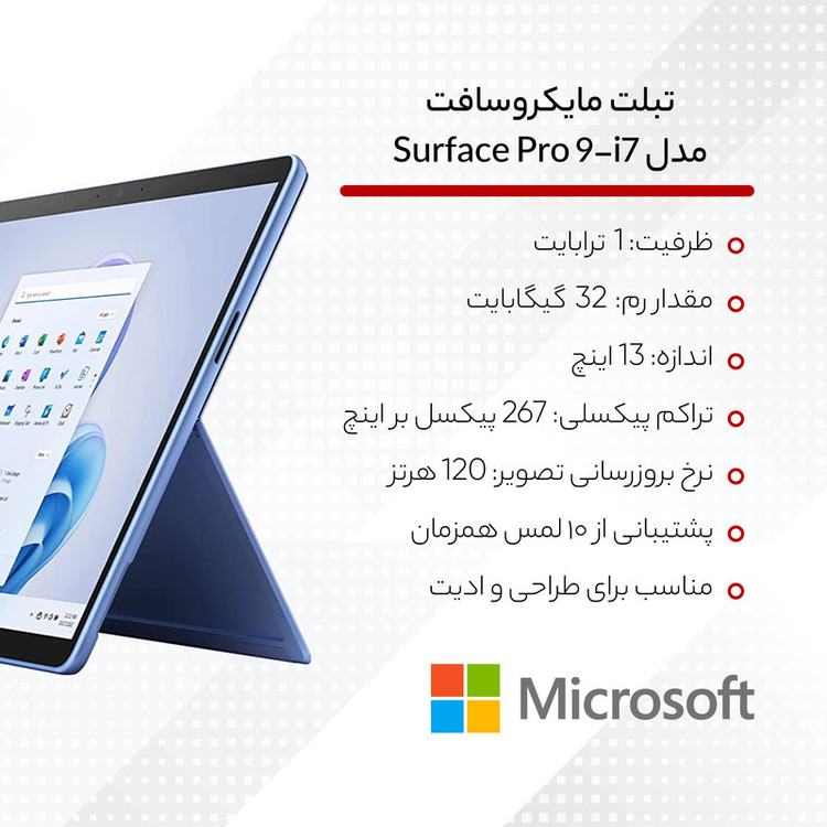 تبلتهای سری Surface مایکروسافت به عنوان قدرتمندترین تبلتهای این شرکت روانه بازار شدند و باید بگوییم که در رده بیزینیس کلاس عملکرد بسیار شگفتانگیزی داشتهاند. یکی از تبلتهای قدرتمند این شرکت هم مدل Surface Pro 9. صفحهنمایش 13 اینچی این تبلت با رزولوشن 1920×2880 و توانایی نمایش 267 پیکسل در هر اینچ، کیفیت بسیار مطلوبی را به شما ارائه میکند. البته قابلیتهای قدرتمند این صفحهنمایش تمام نشده و باید بدانید که توانایی ارائه نرخ بروزرسانی 120 هرتز را هم دارد. همین امر سبب شده تا عملکرد بسیار روان و بدون لگ داشته باشد. در بخش مشخصات سختافزاری هم این تبلت از پردازنده مدل 1255U سری Core i7 شرکت اینتل بهره برده است که بدون شک در اجرای برنامههای کاربردی عملکرد بسیار خوبی را ارائه میکند. دوربین سلفی 5 مگاپیکسل و دوربین 10 مگاپیکسل در قسمت پشتی این تبلت جذاب را همراهی میکند. جالب است که بدانید دوربین قسمت پشتی این گوشی توانایی ضبط ویدیو با حداکثر کیفیت 4K را دارد. باتری در نظر گرفته شده برای Surface Pro 9 هم به ازای هر بار شارژ صد درصدی در حالت استفاده معمولی، توانایی ارائه طول عمر مفید (زمان آماده بهکار) بیش از 15 ساعت را دارد. در مجموع باید بگوییم که در بین تبلتهای بیزینس کلاس، Surface Pro 9 میتواند یکی از بهترین انتخابهای ممکن برای شما باشد.